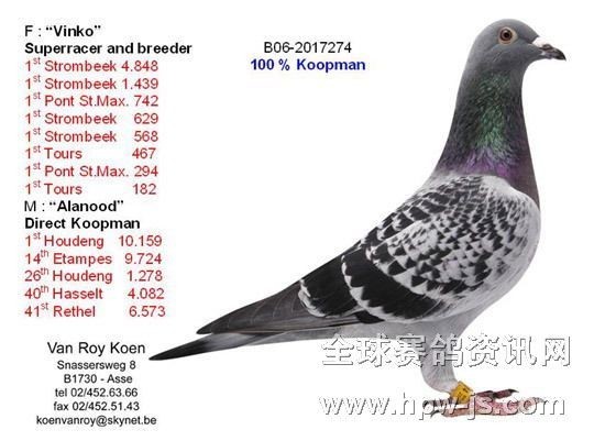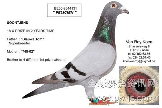 母親:“Supertje”超級雌號,省鴿王亞軍,同孵四冠王號同獲省鴿王冠軍、約11000羽參賽,得過七次冠軍,并再作出省賽鴿王冠軍。