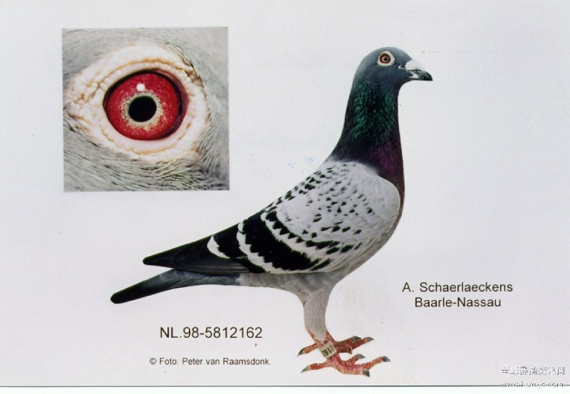 作育理念:同系交配,NL-98-5812162 雨點“Home Alone”獨行俠 原本取名:小魔鬼號(Little Devil),自2000年5月3日贏得克理爾13203羽冠軍后(領先亞軍7分鐘),改名為獨行俠。參賽32次,8次冠軍、十等內(nèi)21次,是絲絲的孫輩。父親是“AceFour”四冠王,11000羽省鴿王賽冠軍。同孵姑姑“Supertje”超級雌號,同窩、同時贏得省鴿王亞軍。此路血脈,同樣孫代,在07年再作出14898羽4名、9319羽7名的優(yōu)異成績,是夏拉肯的主力血系。