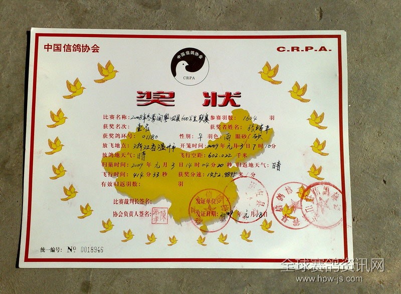 08年冬季閩粵四縣聯(lián)賽在09年元月3日7時(shí)10分在浙江省溫州市開籠,天氣為晴,冠軍鴿于當(dāng)天下午14時(shí)04分歸巢,分速:1452.9895米/分