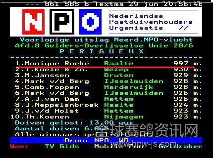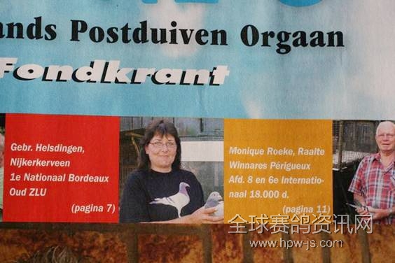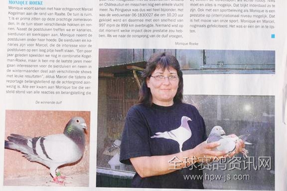 2009年6月27日,荷蘭NPO舉辦了波瑞格斯,中長距離大賽,放飛羽數(shù)6666羽,冠軍空距899公里,冠軍分速997米,比賽日燜熱,逆風(fēng),是一場十分艱難的賽事。冠軍鴿得主是,北荷蘭拉特市的蒙妮克女士。冠軍鴿系灰,黃眼,雄,足環(huán)NL06-1830027,名為「可吝保爾」。(祖父:NL97-2329146「保爾」99年奧林匹克代表鴿)這羽荷蘭冠軍鴿,同時(shí)入賞國際6位,總共18000羽賽鴿。
