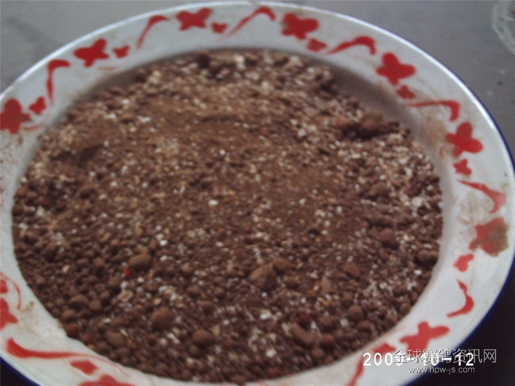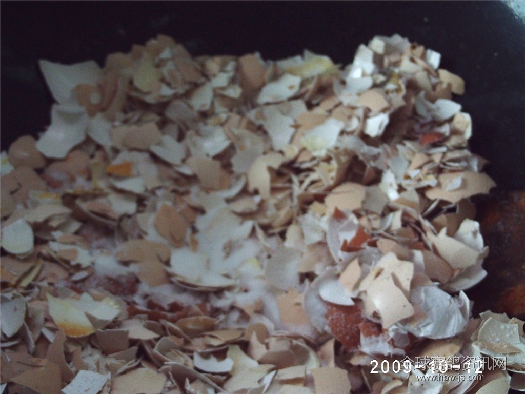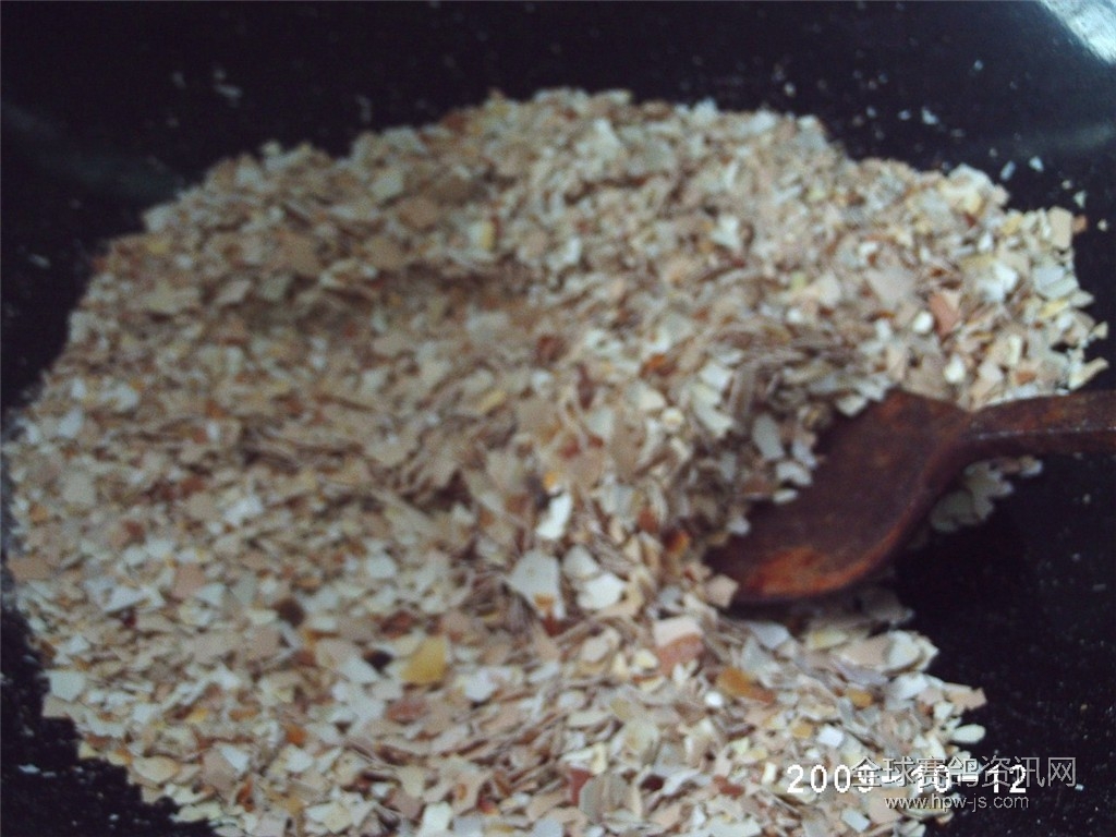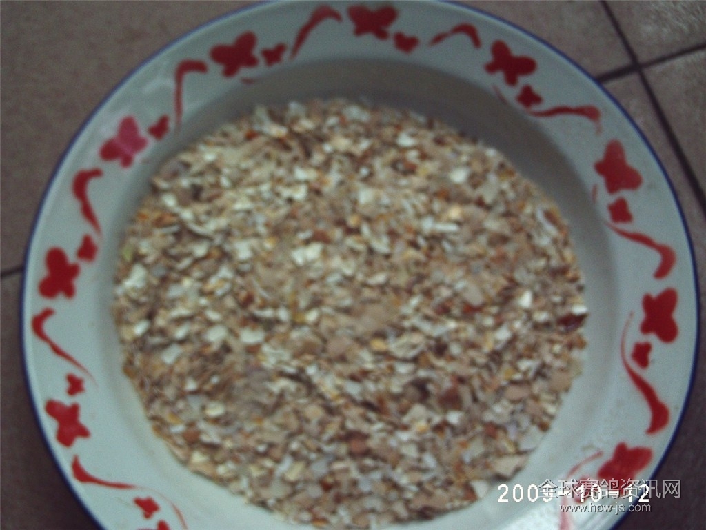 近幾年用鴿子專用保健砂的多了,但我仍堅持自已配制。有時自己配制一些拿去讓弟弟喂鴿,但他棄之不用,他給鴿喂專門買回來的“保健砂*號、麥飯石”等等,我看他用的保健砂里那玤殼渣也很粗,象蕎麥片大小的鋒利片片閃著亮光,都被鴿子丟棄了。從10日6日開始的陰雨連下了7天,今日下午我又配制了些保健砂讓鴿食用,結(jié)果是自配的讓鴿子吃了個盡光,專用的還剩很多。自制保健砂對大中城市的鴿友而言比較麻煩,但對小城市的鴿友來說卻是舉手之勞,上山取紅土,在家炒蛋殼,愛鴿多享用,活動己筋骨,人鴿齊努力,比賽奪冠軍,省錢也省心,想想多安逸。