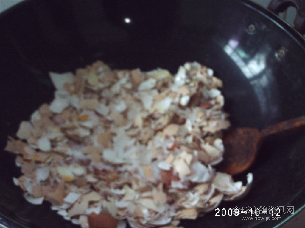 圖二將平時積攢的蛋殼加上鹽在鍋里砂時敲碎。