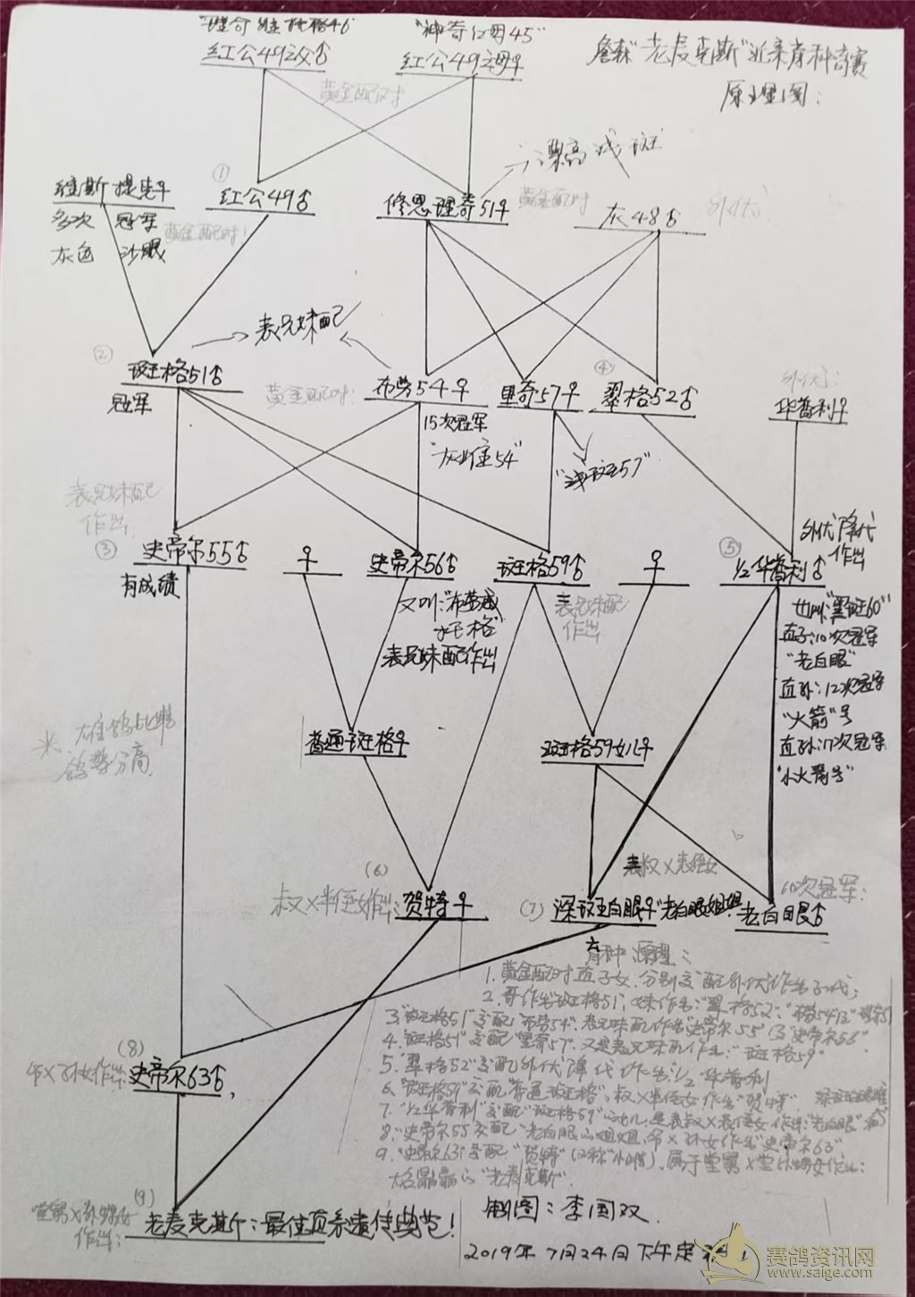 我從開始玩賽鴿,就對中外名家的血統(tǒng)書產(chǎn)生了極大的性趣,研究了幾十位中外名家的血統(tǒng)書,并繪制了近親育種育賽原理圖。