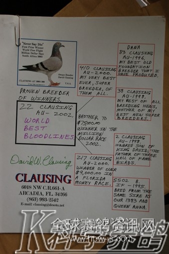 2006年開始養(yǎng)鴿的張寶山先生雖然鴿齡不長(zhǎng),卻在公棚賽中取得了許多不俗的成績(jī)。初養(yǎng)信鴿時(shí)張先生經(jīng)別人的介紹引進(jìn)了不少種鴿,但因?yàn)閷?duì)信鴿的理解還不太到位,加之種鴿質(zhì)量也差一些,2007年作出的幼鴿交公棚120羽僅入圍3羽,于是他將這些種鴿全部淘汰。隨后張先生在孟武的拍賣會(huì)上引進(jìn)了幾羽大衛(wèi)•克勞辛的鴿子,之后又去孟武家中買下了大衛(wèi)•克勞辛“410”直子——一羽2002年作出的砂眼灰雄鴿。引進(jìn)后10天他便給這羽灰雄配了一羽從日本引進(jìn)的楊阿騰血系鴿(也是2002年作出)。2008年春這一配對(duì)作出了6羽幼鴿,均送交公棚參賽,其中方圓順達(dá)公棚1羽,河北影視公棚3羽,順天公棚2羽。這一配對(duì)后代在2008年秋公棚比賽中取得了不俗的成績(jī),分別獲得了方圓順達(dá)公棚決賽第300多名,順天公棚320公里第14名、200公里第8名、決賽分別為第160多名和第180多名,河北影視公棚決賽第188名(張先生將這羽賽鴿拍回,作出的后代又獲得了2009年秋方圓順達(dá)公棚決賽第93名)和第360多名。那年張先生還獲得了方圓順達(dá)公棚決賽團(tuán)體冠軍,入圍5羽,成績(jī)分別為第13名、39名、63名、137名和344名,而冠軍團(tuán)隊(duì)中有兩羽大衛(wèi)•克勞辛血統(tǒng)的賽鴿。