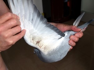 5月28日晚上,家飛結(jié)束時(shí),發(fā)現(xiàn)一羽灰色幼鴿不進(jìn)棚,抓到手中一看,我差點(diǎn)掉下眼淚來,這是我的一羽三關(guān)大獎(jiǎng)賽幼鴿,環(huán)號(hào)000351,這是王者之王配蓋比雌作出的優(yōu)秀雌幼鴿。她體型勻稱,骨架硬朗,羽質(zhì)優(yōu)良,飛行速度極快�?墒�,今天她不幸創(chuàng)傷,整個(gè)左腿從大腿根部被撕開,左翅膀根部被嚴(yán)重創(chuàng)傷,呈黑紫色。我趕緊把它單獨(dú)圈在籠內(nèi),用碘酒清洗傷口,上藥房買來云南白藥膠囊和云南白藥噴霧治療劑,每天早晚口服兩次,對(duì)創(chuàng)傷部位用噴霧劑進(jìn)行噴涂。幼鴿受傷后,身體受到應(yīng)激刺激,不愿意進(jìn)食,為利于消化,改喂清除飼料,并在飲水中加入電解質(zhì)以補(bǔ)充營養(yǎng)。經(jīng)過一周的精心治療,現(xiàn)在這羽幼鴿已經(jīng)能夠站立并獨(dú)立進(jìn)食,身體狀況良好,經(jīng)對(duì)口腔粘液和糞便進(jìn)行檢驗(yàn),小鴿子完全健康。今天,我已經(jīng)將她放入大棚,與其他伙伴在一起玩耍,看到她能迅速恢復(fù)健康,我的心里真是高興極了。我祝福她早日痊愈,重返藍(lán)天。