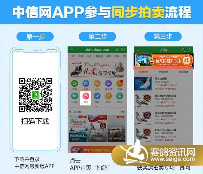 | 應(yīng)上級(jí)管理部門防疫要求,積極響應(yīng)國(guó)家號(hào)召,為抗擊疫情,保護(hù)鴿友安全,我公棚與中信網(wǎng)chinaxinge.com合作推出“現(xiàn)場(chǎng)與網(wǎng)絡(luò)同步拍賣服務(wù)”,所有鴿友可使用電腦或手機(jī)登錄中信網(wǎng),并同步出價(jià),享受足不出戶參與競(jìng)拍的便利和刺激!