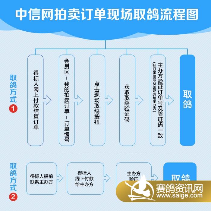 網(wǎng)上得標(biāo)的鴿友可以委托朋友代為現(xiàn)場(chǎng)取鴿,取鴿步驟:①登錄會(huì)員區(qū)結(jié)算訂單;②查看訂單編號(hào),點(diǎn)現(xiàn)場(chǎng)取鴿按鈕,獲取訂單取鴿驗(yàn)證碼,系統(tǒng)會(huì)自動(dòng)發(fā)送手機(jī)短信到拍賣會(huì)員指定手機(jī);③將驗(yàn)證碼報(bào)給公棚工作人員,驗(yàn)證成功;④簽發(fā)取鴿憑證,交接拍賣鴿。