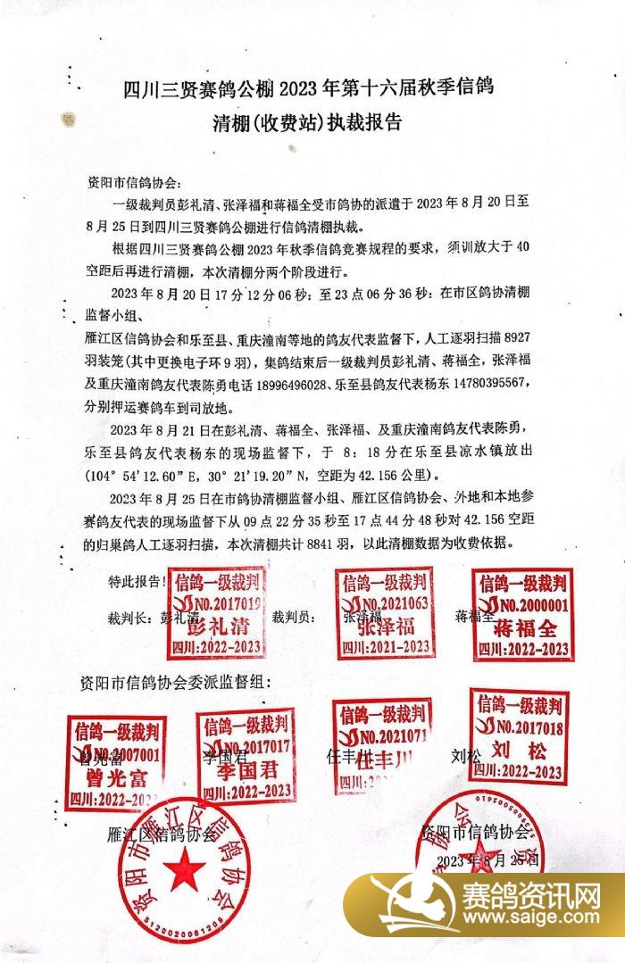 三賢公棚2023年第十六屆秋季信鴿清棚(收費(fèi)站)執(zhí)裁報(bào)告