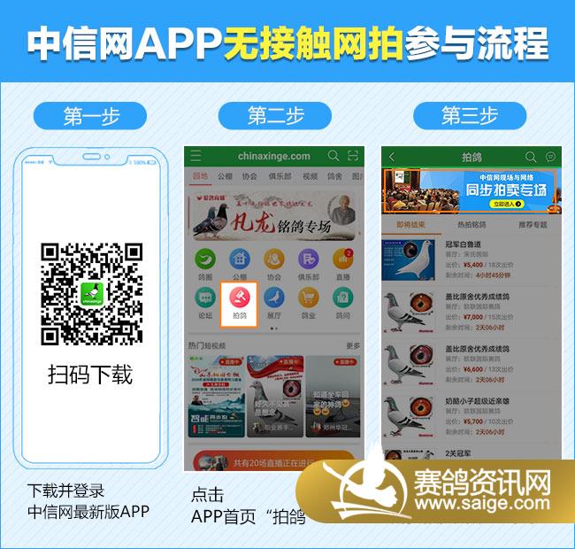 | 為了減少大規(guī)模人群集聚,同時為了讓全國各地的鴿友更便捷地參加我公棚秋季加站賽獲獎鴿的拍賣,我公棚與中信網chinaxinge.com合作推出“無接觸智能網絡拍賣服務”,所有鴿友可使用電腦或手機登錄中信網,觀看視頻講解直播,并同步出價,享受足不出戶參與競拍的便利和刺激!本公棚誠邀各位鴿友下載中信網APP觀看直播,并參與同步競價。