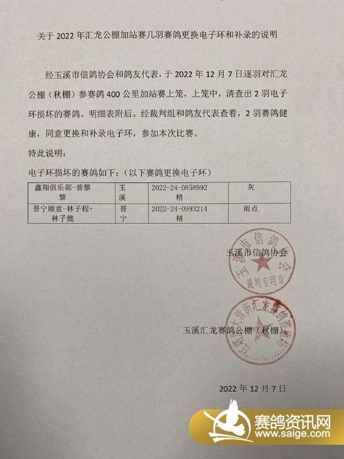 關(guān)于2022年匯龍公棚加站賽幾羽賽鴿更換電子環(huán)和補錄的說明
